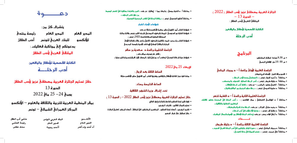 A l'occasion de la cérémonie de remise des prix de la 13 ème édition du concours arabe ATB Mustapha Azouz, un Colloque Arabe sera organisé le 24 Mai 2022 siège ALECSO-Tunis dont le thème est : Récit de voyage.