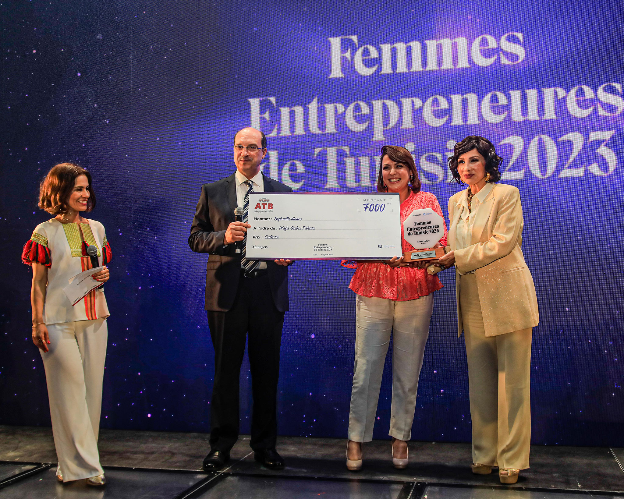 La cérémonie des Trophées Femmes Entrepreneures constitue une occasion exceptionnelle de réseautage, réunissant plus de 300 personnes, parmi lesquelles ont assisté des ambassadeurs, des diplomates, des entrepreneurs, des banquiers et des décideurs économiques. Parmi les lauréates des Trophées Femmes Entrepreneures 2023, Mme Wafa GABSI s’est vue décernée le trophée culture soutenu par l’ATB et ce, dans le cadre de son projet « ARCHIVART » à savoir une plateforme offrant de la visibilité aux artistes contemporains.